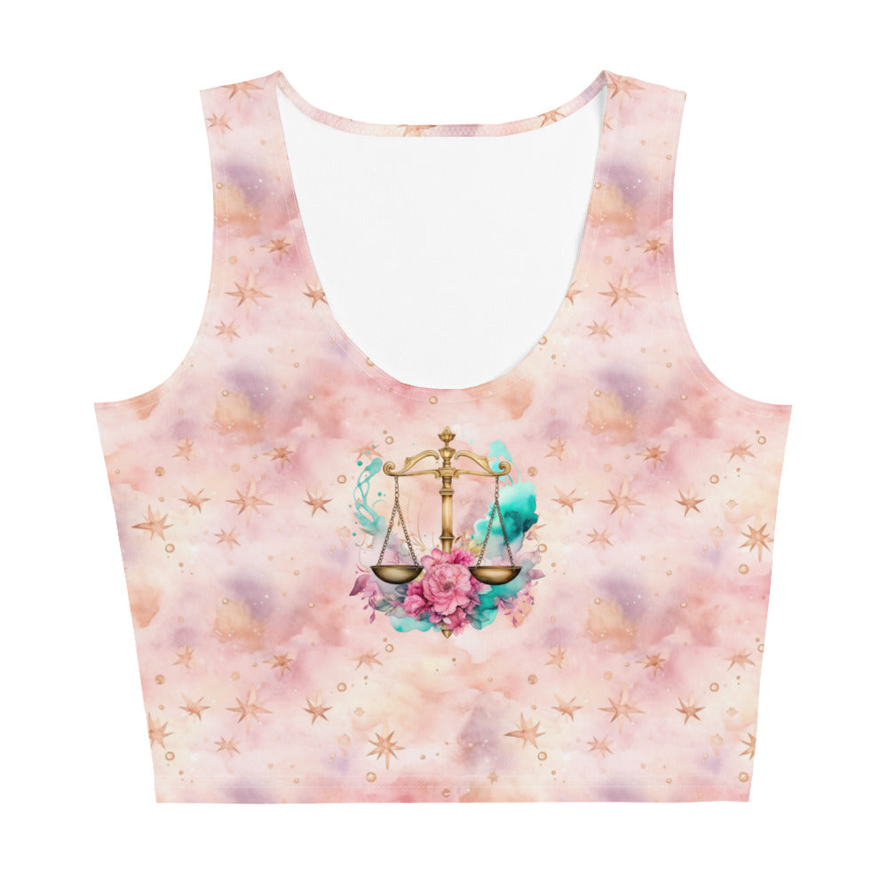 Embrace cosmic harmony with our Zodiac Collection Sleeveless Crop Top, adorned in a celestial pink and gold star pattern, featuring the Libra zodiac symbol surrounded by enchanting flowers in a stunning watercolor print.