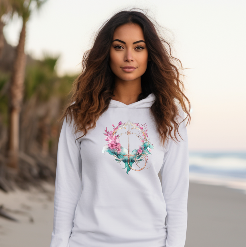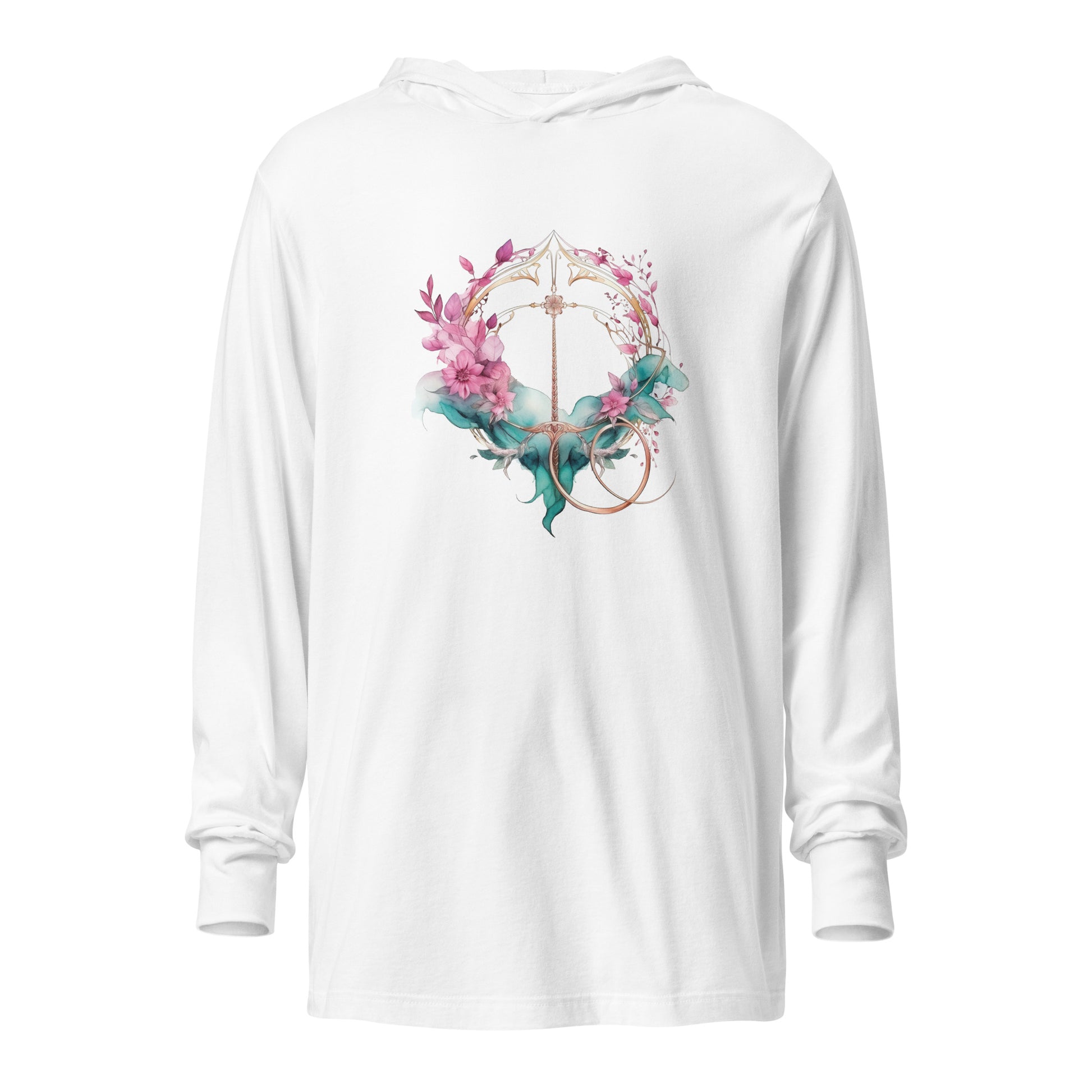 Embark on a cosmic odyssey with our Zodiac Collection Hooded Long Sleeve T-shirt, adorned in a mesmerizing watercolor print featuring the Sagittarius zodiac symbol—a dynamic archery set surrounded by vibrant flowers.