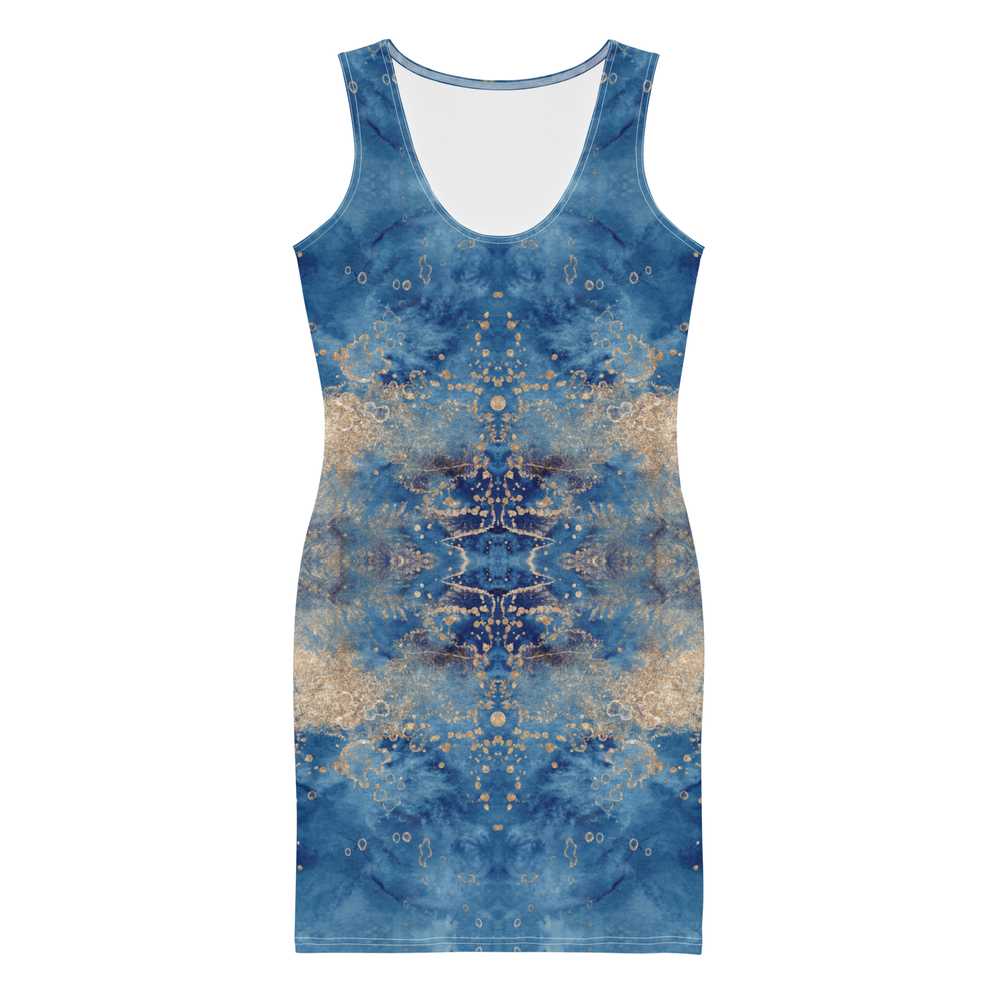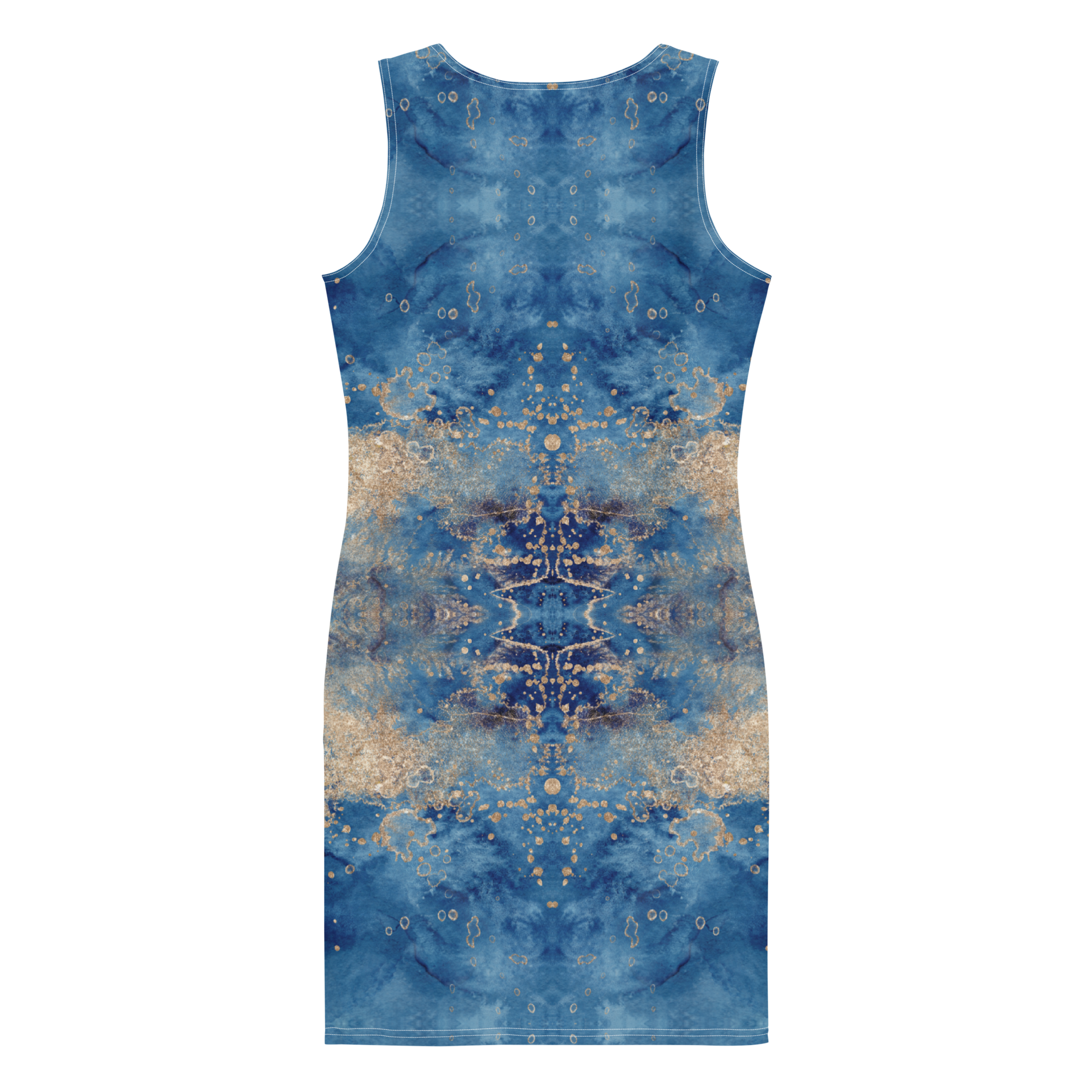 Introducing our stunning form-fitting tank dress, made from the same high-quality, stretchy fabric as our popular one-piece swimsuit. The mesmerizing print features sand and ocean hues, with subtle shades of gold and blue that evoke the calming tranquility of the beach.